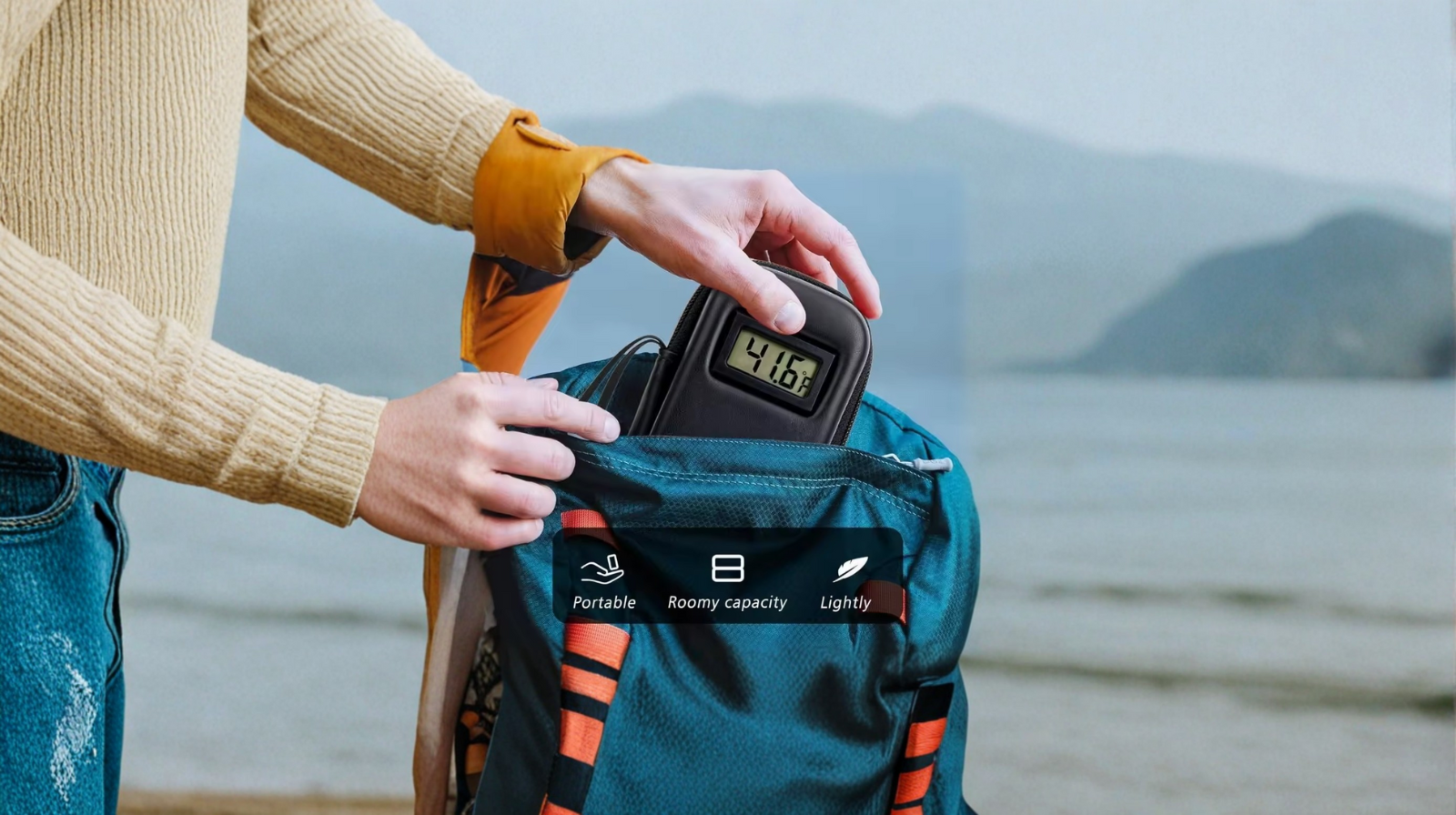 Large LCD with real-time Celsius/Fahrenheit readings and safety alerts.